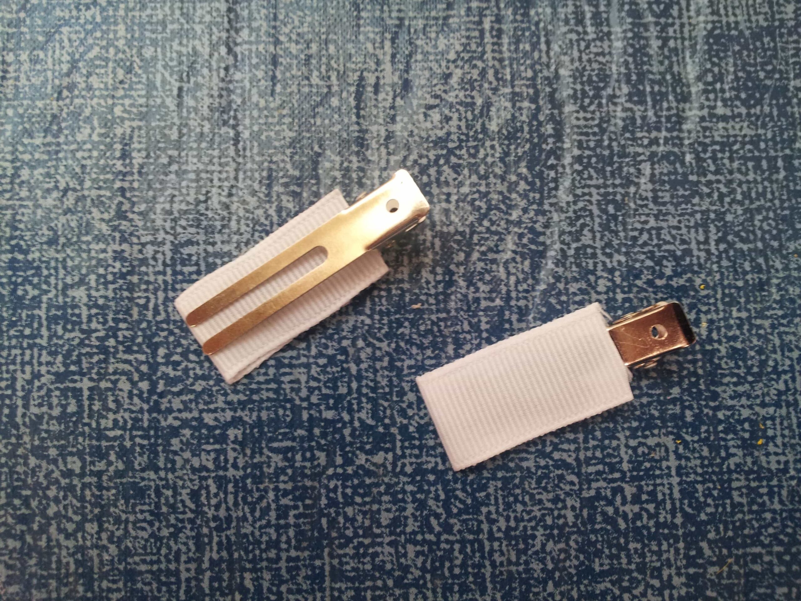 Cut ribbon long enough to cover both the inside and outside of one prong section of the alligator clip. Glue ribbon to the inside of the angled prong section, wrap around point, and glue to the outside of the angled prong section. Make a nice crease at the point.